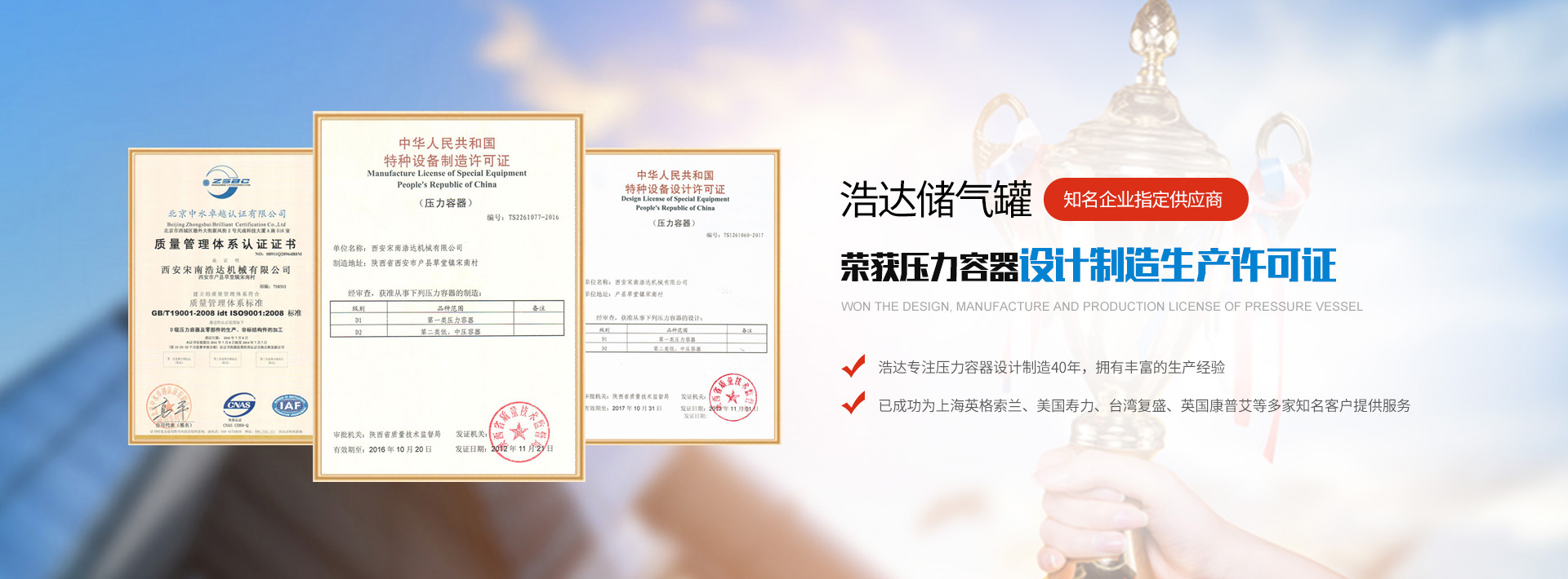 誠(chéng)信經(jīng)營(yíng)40余年現(xiàn)有壓力容器/不銹鋼儲(chǔ)氣罐設(shè)計(jì)、制造、C級(jí)鍋爐生產(chǎn)許可證,是部級(jí)先進(jìn)企業(yè),省級(jí)安全生產(chǎn)單位,市級(jí)標(biāo)準(zhǔn)化先進(jìn)企業(yè),市級(jí)重合同、守信譽(yù)單位,二級(jí)計(jì)量企業(yè)。
